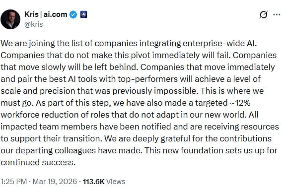 A 12% staff reduction was revealed by cryptocurrency exchange Crypto.com on March 19th. A trend observed across corporate sectors, layoffs are a component of the company's efforts to incorporate artificial intelligence into its operations. “We are joining the list of companies integrating enterprise-wide AI. Companies that do not make this pivot immediately will fail. Companies that move slowly will be left behind. Companies that move immediately and pair the best AI tools with top-performers will achieve a level of scale and precision that was previously impossible. CEO Kris Marszalek posted on X.