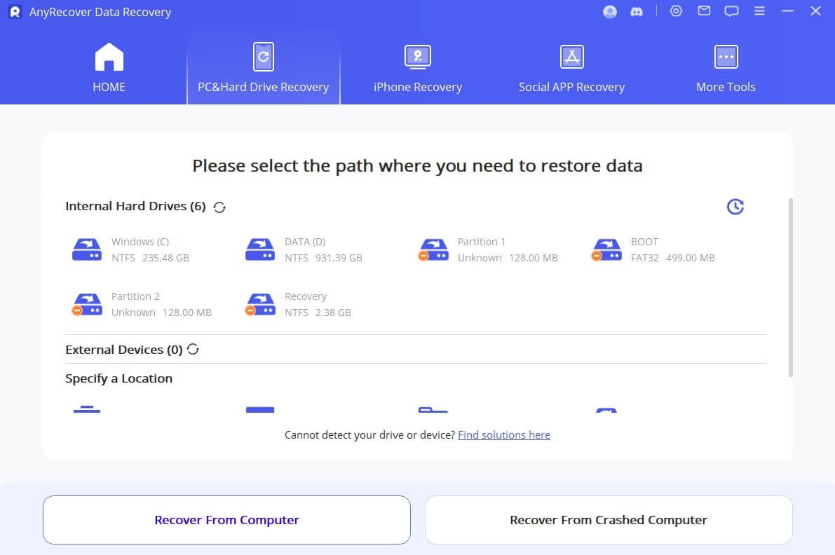AnyRecover Data Recovery Free is a versatile and user-friendly software, allowing data recovery on both Windows and macOS devices. You can use this tool to restore deleted files from hard drives, SSDs, USB drives, memory cards, and other external storage media. The software features an easy-to-use interface, allowing even beginners to recover deleted data effortlessly. Despite its free limitations, this tool remains a top choice due to its simple and quick recovery process.